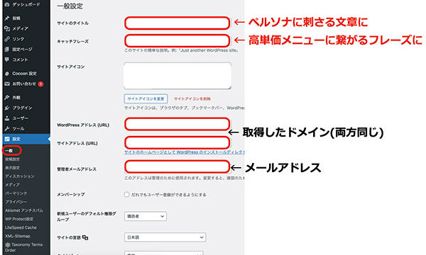 ホームページの下準備ができたらサイトの設定をします。ログインしてダッシュボードから「設定」→「一般」を選択し「サイトのタイトル」と「キャッチフレーズ」を入力します。ペルソナに刺ささる高単価メニューに繋がるようなフレーズにします。